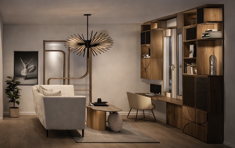 Résultat : un appartement entièrement transformé, où chaque mètre carré est optimisé, avec un grand espace de vie convivial, des rangements intégrés et un coin bureau parfaitement adapté au travail à domicile.